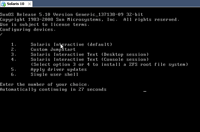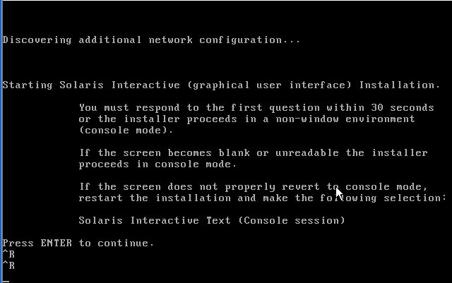 这里按回车键以后会启动Solaris10的对话控制台安装界面,如果不按任何键,30秒后会默认进入控制台(无窗口)模式。