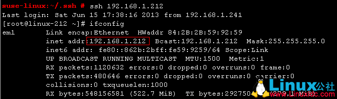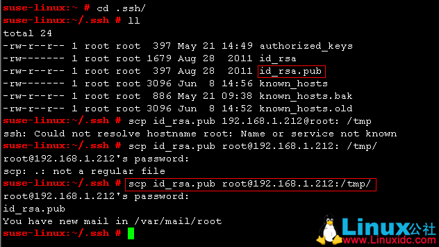 SUSE-linux:~/.ssh # scp id_rsa.pub root@192.168.1.212:/tmp/