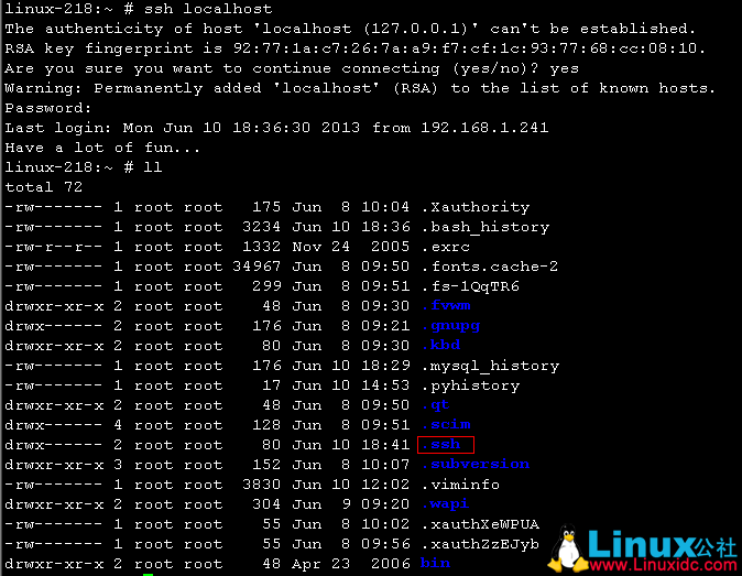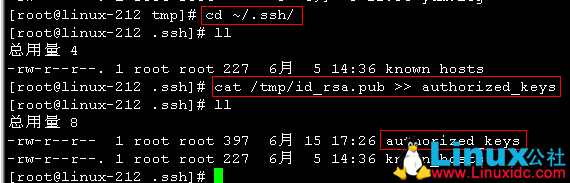 linux-218:~/.ssh # cat /tmp/id_rsa.pub >> authorized_keys