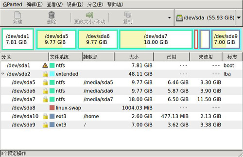 这张图已经是调整后的图了。我来说一下调整的过程。用live CD启动电脑,让硬盘里的系统不被占用。先把swap分区删掉。释放出2G的空闲空间,再新建一个swap,大小与我的内存相当就可以了。但把这一个G的空间挂载为/home又有点捉襟见肘。反正给ubuntu的可用空间只有10个G多一点。而其它的分区都是NTFS的,装着XP系统。现在的ubuntu已经可以很好的支持NTFS分区格式。所以,现有的NTFS分区不必做任何的调整。10G的UBUNTU分区如果不够用,就可以把文档放到NTFS分区上。但同为ext3格式的/home则应该尽量大一点。想到/目录不用8.6个G那么大,只是装个系统而已,而且该装的软件也装得差不多了。只有/home目录在不断扩大。所以应该把/目录的容量调整一点到/home目录。现在我的/home目录经过整理后为350M.至少要从/目录调整一个G到/home目录。也是用liveCD启动进行操作。因为此时,硬盘的所有分区都处于释放状态,很方便做调整。在LIVE系统下启动分区管理器,可以很方便在调整分区的大小。先把/目录调整为7个G.这样就释放出1.6G的空闲空间。再把这部分空间加到/home目录上。