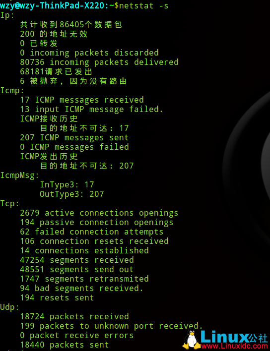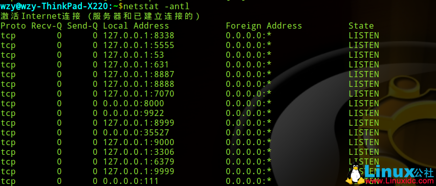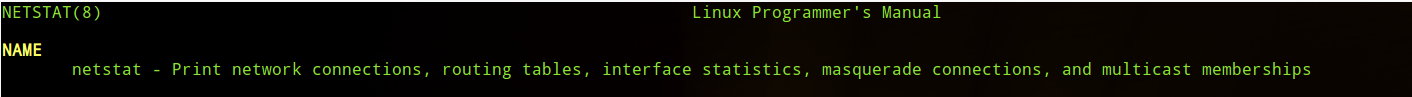 netstat命令,用于显示网络相关信息,如网络连接,路由表,接口状态(interface statistics), masquerade 连接,多播成员(multicase memberships)等等。