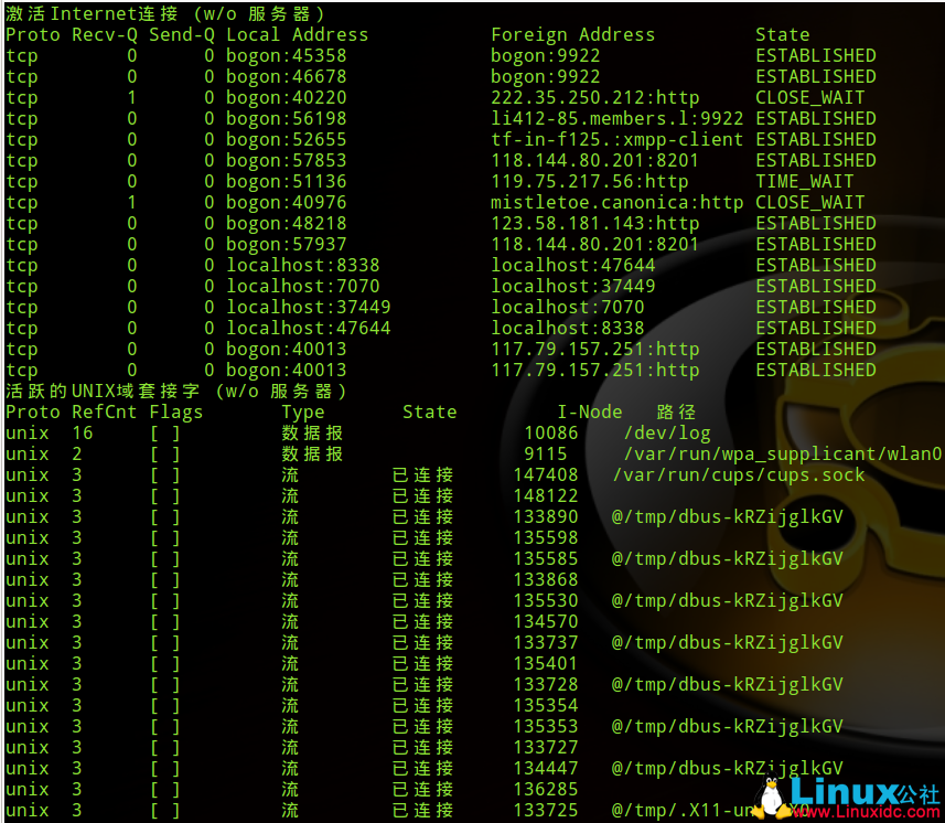 另一个是活跃的UNIX域套接字,称为有源Unix域套接口(跟网络套接字一样,但是只能用于本机通信,性能可以提高一倍)。Proto:显示连接使用的协议,RefCnt:表示连接到本套接口上的进程号,Types:显示套接口当前的状态,Path:表示连接到套接口的其他进程使用的路径名