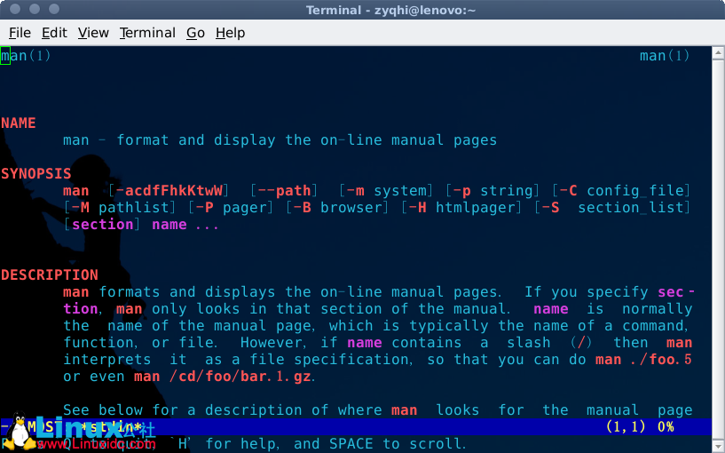 此时其实已经可以使用了,例如运行man man以后就可以看到彩色的页面,但是存在两点问题:一是此配置只对当前终端有效,二是操作习惯会发生改变(比如原先向下翻页是j命令会发生改变),因为毕竟most的操作方式和less还是不同的,除非习惯新的方式,否则最好经过配置。配置很简单,设置环境变量,配置操作方式。