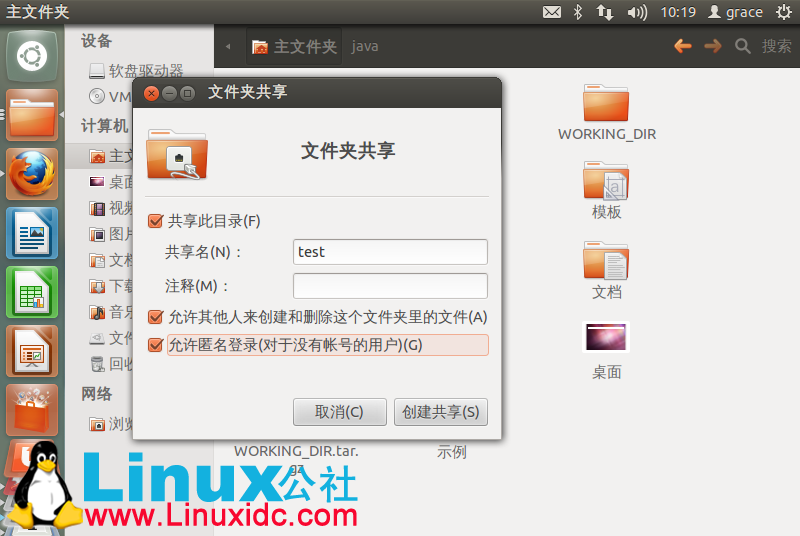 在选择共享此目录的时候点勾。这个时候就会自动下载samba。这个用于文件共享。