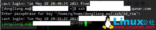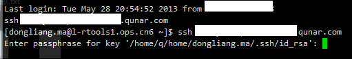 登录跳板机成功后,在跳板机分配的终端中使用ssh命令再登录开发机,跳板机和开发机之间采用带密码的ssh验证,因此需要输入ssh私钥的密码。