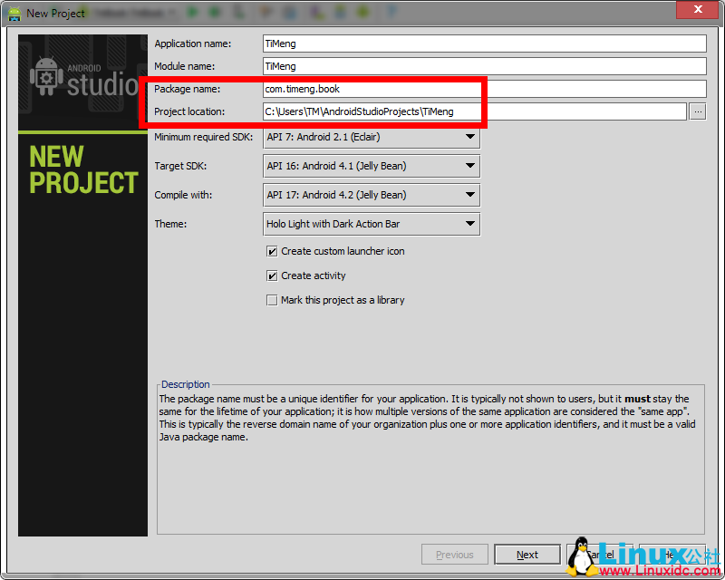 3.2新建工程注意下图红框中的两个文本框,package name默认是com.example.项目名 ,改掉,不要使用com.example开头