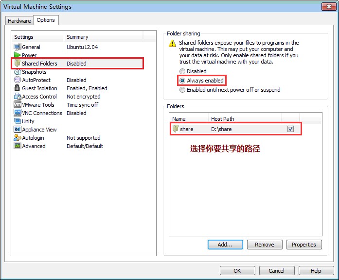 按照图示配置。这样,Ubuntu下的/mnt/hgfs/share文件夹与Windows的D:/share文件夹相对应。