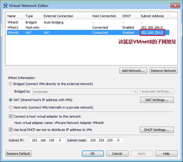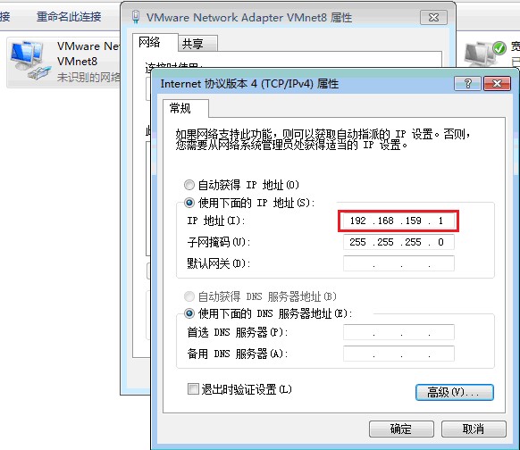 确保Windows主机上的VMnet8的IP配置为192.168.159.1。