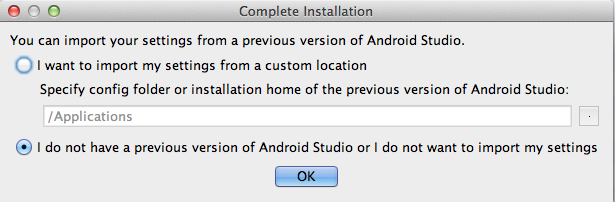 安装成功后在Finder的应用程序目录中找到Android Studio,双击打开,界面如下:
