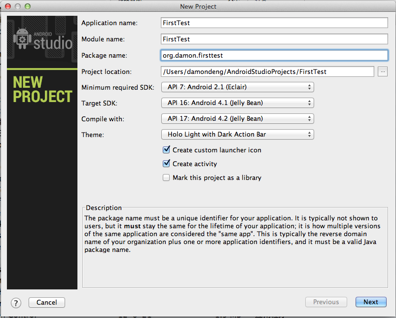 然后是填写项目信息,没什么特别的,就是“Package name(包名)”一栏按传统做法使用反序的域名就好了,其它随便选的。