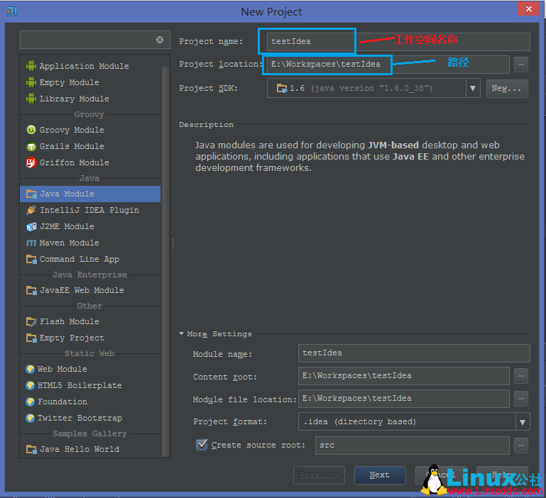 2.选择项目类型 这里选Java Module 自定义工作空间名称 和路径