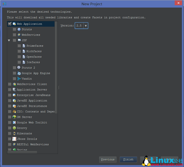 3.选择需要用到的框架组件 这里只选了第一个 Web Application > Finish