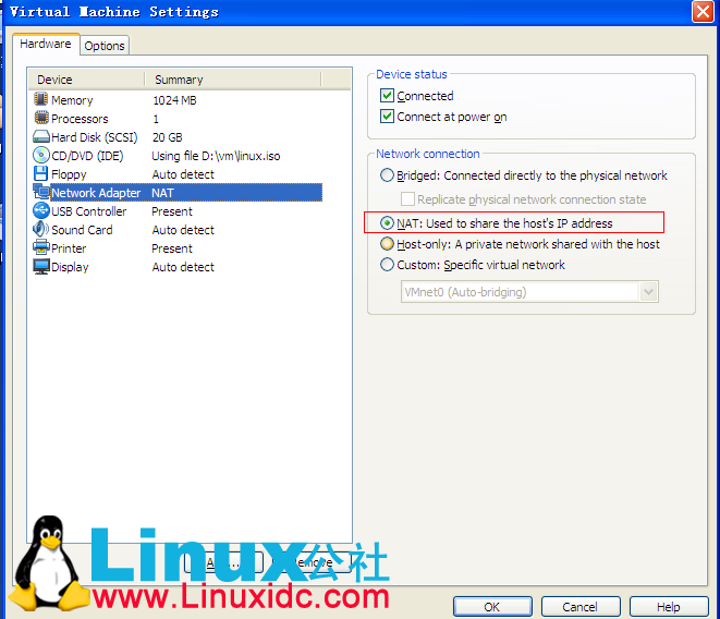 2)点击Network Adapter 设置如下图所示,首先我们在虚拟机中将网络配置设置成NAT,