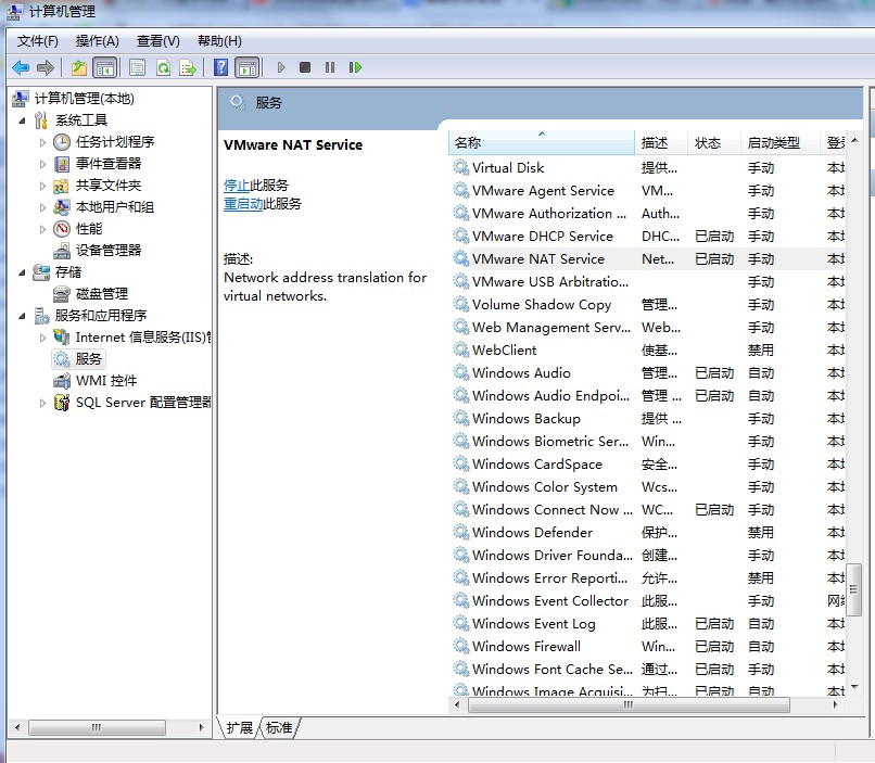 3、进入Windows操作系统,然后右键点击我们的电脑,进入到管理界面 计算机-> 管理->服务和应用程序->服务,找到如下服务进程 VMware DHCP Service, VMware NAT Service。 分别点击右键->启动