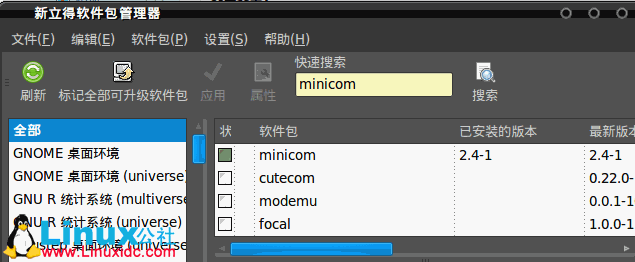 minicom是linux下的一个串口通讯工具,使用起来十分方便,类似在windows下的超级终端。在Ubuntu下进入终端,输入sudo apt-get install minicom,或者在新立得软件包中查找minicom,见下图