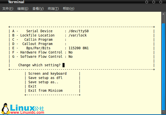 至此minicom就配置完成了,以后登录minicom前只要在终端中键入minicom即可。