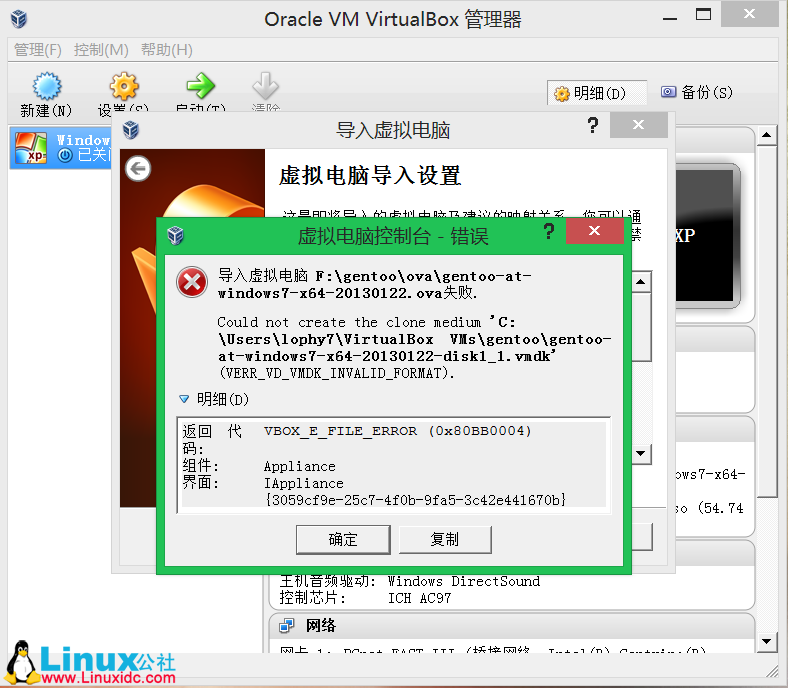 在VirtualBox中导入原先做的Gentoo Linux操作系统的虚拟机的时候,出错了。