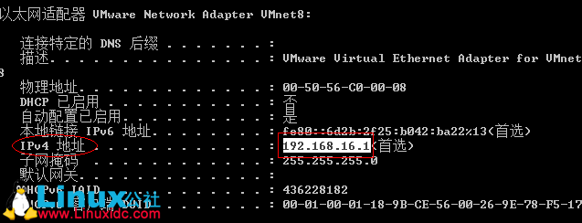 首先确保虚拟网卡(VMware Network Adapter VMnet8)是开启的,然后在windows的命令行里输入“ipconfig /all”,找到VMware Network Adapter VMnet8的ipv4地址(例如:192.168.16.1),如下图: