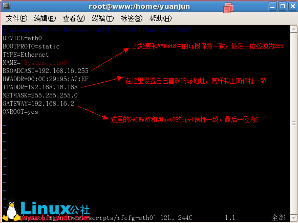 启动并进入centos系统,在终端中输入“vim /etc/sysconfig/network-scripts/ifcfg-eth0 ”来修改ip配置,然后输入如下图的配置信息: