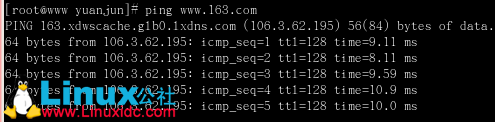 保存退出后,在终端中输入“service network restart”重启网络服务,然后在终端中“ping www.linuxidc.com”查看返回如下信息即表示成功: