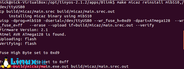 3. 将将程序下载到节点:$ make micaz reinstall mib510,/dev/ttyUSB0显示结果为: