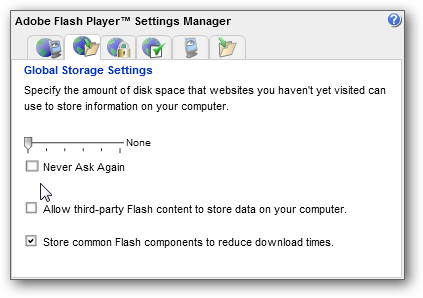 你也可以通过将滑块滑向 None 并点选永不再问。如果你这么做,并取消对 允许第三方在你电脑中储存数据 的选择,你将不会再看见 广告 Flash cookie 了,但这样会导致很多其它 Flash 应用出错。