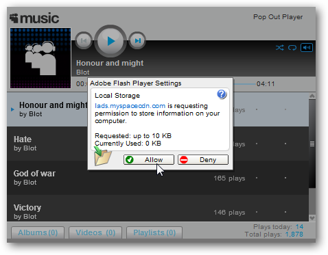在下面的例子中,我将设置本地储存为 None ,然后访问 MySpace,尝试播放歌曲,它将提出储存数据的请求。