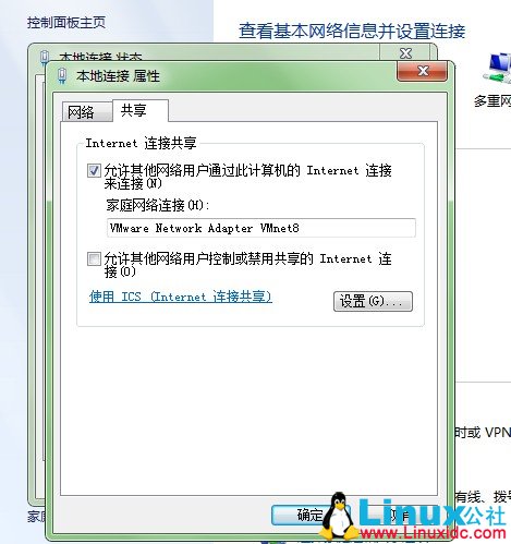 打开“网络和共享中心”,点击“本地连接”打开“本地连接状态”如下图左面部分,点击属性打开“本地连接属性”如图右半部分,选中“允许替他网络用户通过此计算机的Internet连接来连接(N)”点击确定,