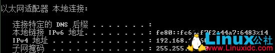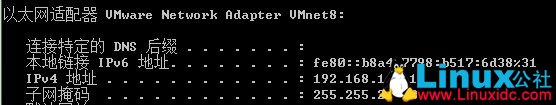 此时,可以用windows下命令行格式下用ipconfig -all查看一下各适配器的地址,在这里,我们需要关注的是wmnet8的地址和以太网本地连接的地址: