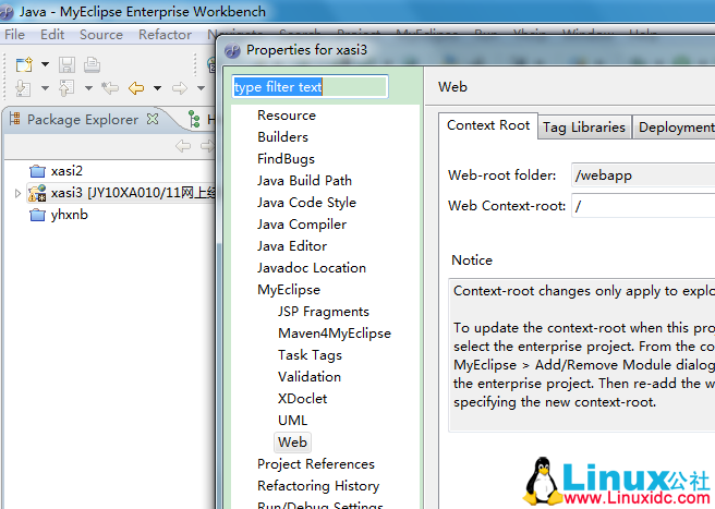 2)在弹出的“Properties for xxx”对话框中,选择“Myeclipse”选项卡