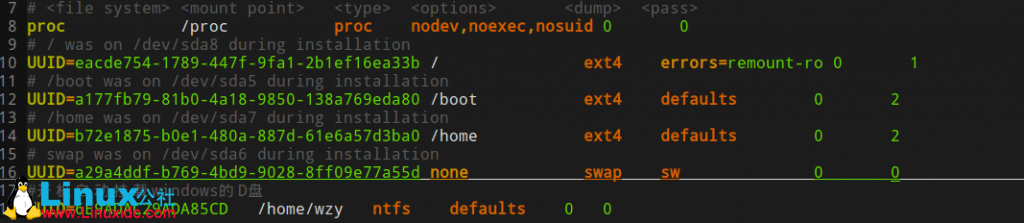<fs vfstype> : 挂载磁盘类型,linux分区一般为ext4,windows分区一般为ntfs