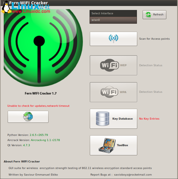 Fern Wi-fi cracker是python编写的一款无线网络破解测试工具,提供了GUI界面。通常情况下,你需要分别启动aireplay-ng, airodump-ng and aircrack-ng 进行无线网络的破解,但是 Fern-Wifi-cracker把这件事情变得简单。