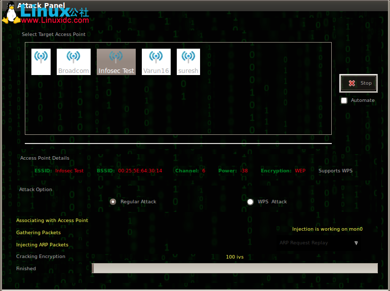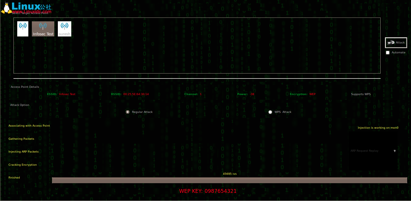 接下来你只需要选择网络, 点击“Wi-fi attack”即开始WEP破解过程