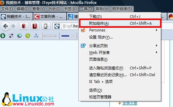 1、选择firefox的菜单栏选择【工具-》附加组件】如图所示: