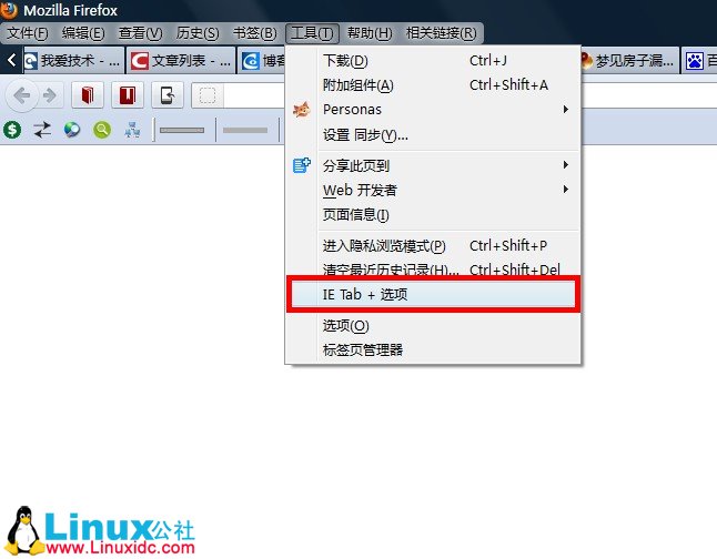 ①、选择firefox的【工具-》ie tab+ 选项】,如下图所示
