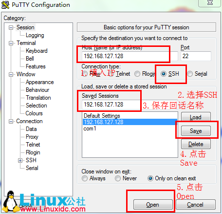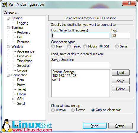 2.输入远程主机IP或域名,设定端口为22号端口,登录协议选择SSH,点open登录
