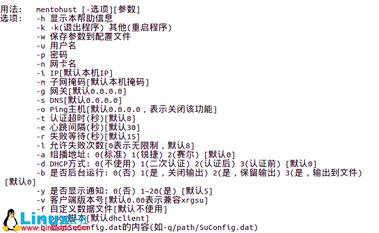 安装成功后,可以使用命令sudo mentohust -h查看帮助信息如下: