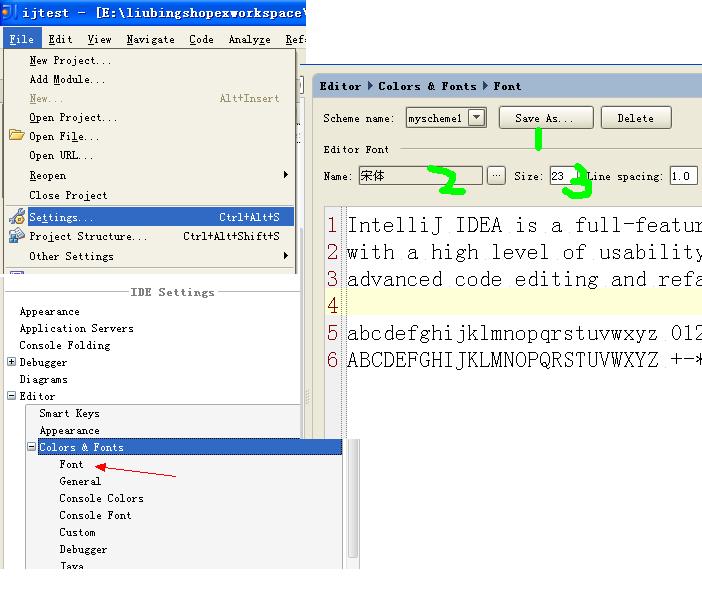 如上图,找到 file-->setting-->editors-->colors&fonts--->font.
