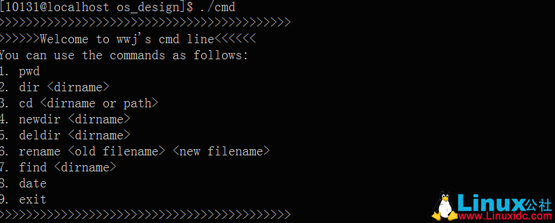ls 显示os_design下的文件:cmd.cpp 为本次课程设计的源文件,采用语言为C++