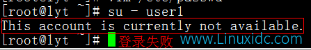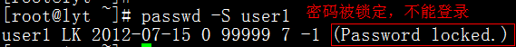 [root@lyt ~]# passwd -l user1 #使用-l指令将user1锁定,这样就不能登录了,但是可以从root账户切换到user1用户