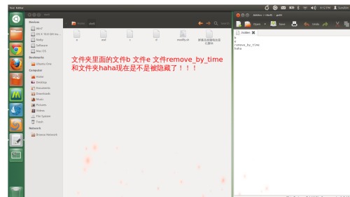 今天我想讲的是如何像Windows下 即使文件 或者 文件夹 不以点开头也能做到同样隐藏的,目的!首先在你要隐藏文件的同一文件夹下创建一个名为.hidden的隐藏文件,在里面填写你要隐藏文件(或者文件夹的名字)此时当你再打开那个文件夹时 包含在.hidden 文件里面的文件名 所对应的文件(或者文件夹)此时已经隐藏了!