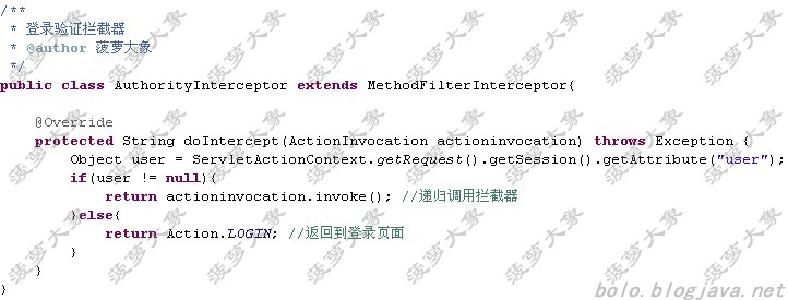 要实现登录拦截的功能,最关键的就是要实现拦截类了,在common包下面再增加一个interceptor包,创建AuthorityInterceptor类,并继承MethodFilterInterceptor,为什么继承它呢?因为它是对方法进行拦截,而在这个应用中,我们是对绝大部分的方法进行拦截,而对个别例外的方法排除。