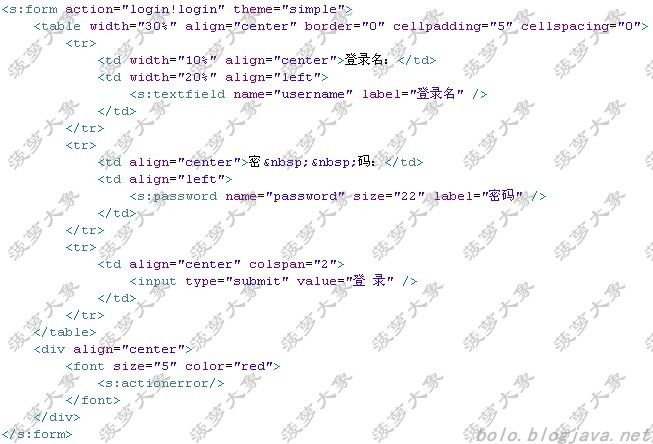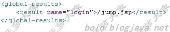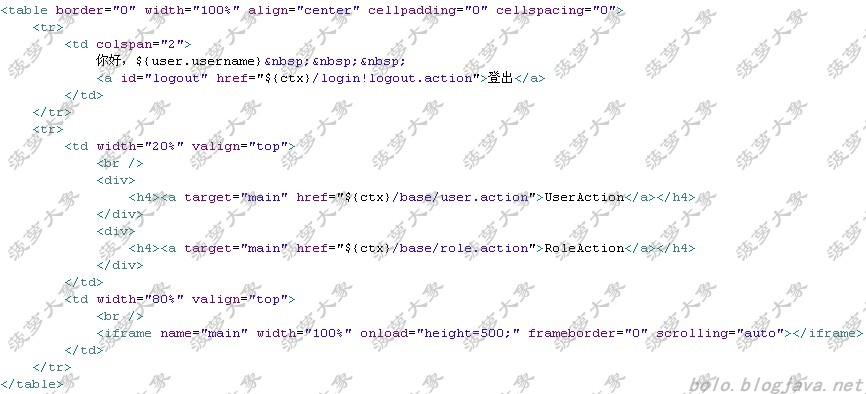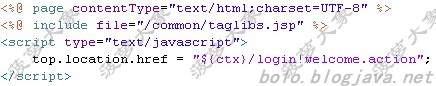 还记得拦截器里面的return Action.LOGIN 这句吧,当程序执行完这一行后,就会到struts.xml文件中去找name为login全局转向配置,因此这里我设置为一个jsp页面,而没有定义成/login!welcome.action就是因为如果按这样做了,那么转向后,登录页面将显示在iframe框架中,这肯定不是我们希望看到的。解决这个问题,网上有很多方法,我查了一下,再结合实际,其实没那么复杂,一句话就可以搞定。如果使用frameset这种做法也有效,大象同样测试过,只不过例子中的代码没有这样写而已。