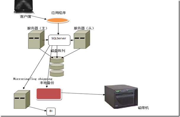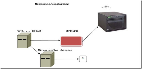 正因为这样的备份恢复方案无法达到我们及时恢复数据库和最大限度保障数据的要求,于是我们不得不考虑其他更快恢复数据并减少数据丢失的方案,我们先考虑SQLServer给我们提供的方案(硬件方案后面讨论),数据库里面有两种技术方案可以使用,一种是Mirroring,另一种是Log shipping(两种技术的细节这里不讨论)。