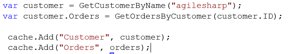 下面,我们看到第二个问题。这个问题主要是由于第一个问题引起的:原本在缓存Customer的时候,已经将Customer的其他信息,例如Order,Product已经缓存了。但是很多的技术人员不清楚这一点,然后又把Customer的Order信息去缓存在其他的缓存项,使用的使用就根据Customer的标识,例如ID去缓存中获取Order信息,如下代码所示: