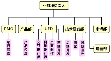 其中,交互设计、视觉设计、页面制作和前端(JS)开发,都隶属于UED(用户体验设计)部门;后端开发、测试、网络运维,都隶属于技术部门。PMO、产品部、UED、技术部作为强矩阵式的架构,都由业务线的负责人直接管辖。项目运作上由项目管理部负责统筹管理执行。