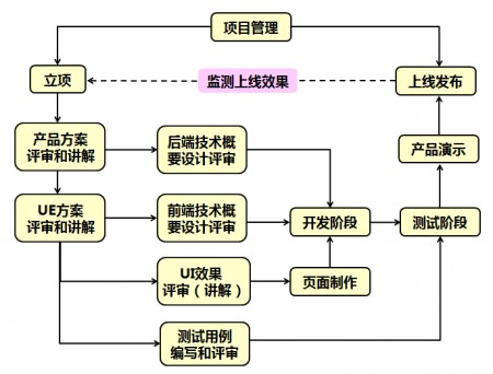 - UI效果设计完成并评审通过后,进行页面制作(切图)环节,将页面提供给开发人员做嵌套。前、后端概要设计完成并评审通过,开发人员拿到页面,进入开发阶段。测试用例编写完成并评审通过,同时也拿到了开发人员提供的测试版本,进入测试阶段。当测试基本完成后,在正式上线之前,给项目的核心干系人(主要是指各职能部门的领导)做产品演示,用来展示项目团队在项目执行期间的工作成果。产品演示环节,视项目规模大小情况而定,不是必须要有的环节。产品上线后,进行数据监测,并根据数据情况持续进行产品优化,逐渐满足立项之初战略目标的预期。