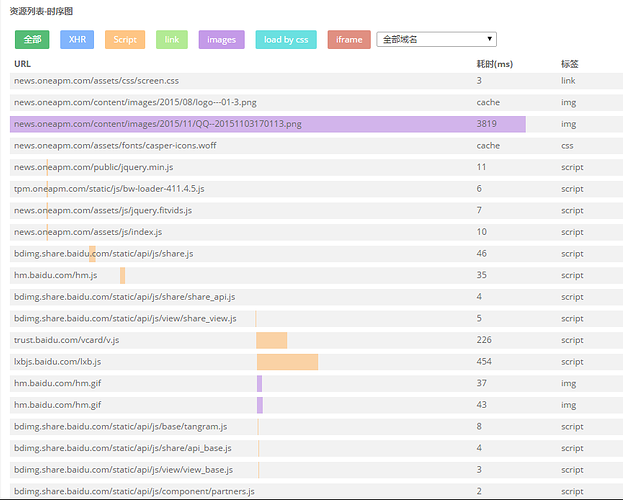 列表时序图”页面,我们可以在这个页面及其详细的看到拖慢整个页面加载的图片、脚本、css